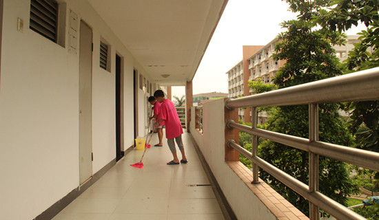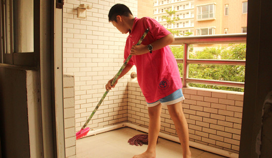 下完课,我们立即回宿舍热火朝天地干起来,我负责拖地和收拾被子。就在我们快干完时,却发现了一个新的问题: 地板老是不干!我和孔德驰在屋子里想办法,而班长和另外一位同学正在快活地清理阳台,我突然觉得很担心,这下我们的“文明宿舍”会不会要泡汤了。