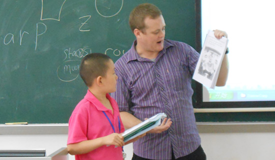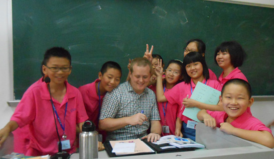 在这个夏令营中,我很喜欢我所有的外教,但是要数我最喜欢的老师,那就非Hans老师莫属了。Hans老师来自美国,已经来中国好几年了。现在,他是广东外语外贸大学的老师。他有着一头卷卷的、短短的黄头发,和蓝色的大眼睛和亲切的笑容。他的课堂非常的生动有趣,充满了欢声笑语。他的肢体语言也很丰富,当我们不明白他说什么的时候,他总会通过他丰富的肢体语言让我们明白。