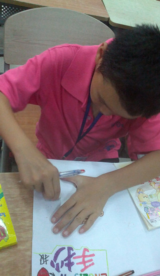 到了下午的课外活动时间,我们按照上午的分工进行合作。我看了一下其他的小组,似乎大家谁都想得No.1,这让我们倍感压力。看到其他组都在动手了,我们也赶紧行动起来。我们先画了一条很beautiful的 fish,然后在上面写了绕口令。接着画了一个rectangle,在上面写了栩栩如生的英语故事。然后画了一朵cloud,写了一首动听的歌《rain rain go away》。最后写上一个大大的题目再加上一些装饰,最后附上我们的大名就大功告成了!