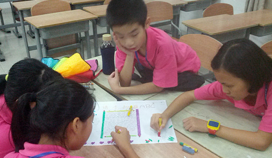 我们小组也立刻行动起来,一起商量看谁翻阅词汇书和外教书,谁涂颜料、谁写字等……