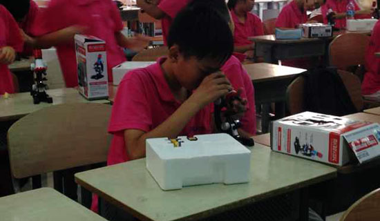 开始上课时,老师先讲解用显微镜能看到有生命的生物的细胞,然后她给了我们看细胞的图片,再讲解如何用显微镜。开始用显微镜的时候,我非常激动,因为我用我那个破了一点的放大镜来观察细胞,可是什么的照不出来。我冥思苦想了很久,最后在一位同学的帮助下,我终于用显微镜照出了细胞。原来如此!照细胞是要讲究方法的。