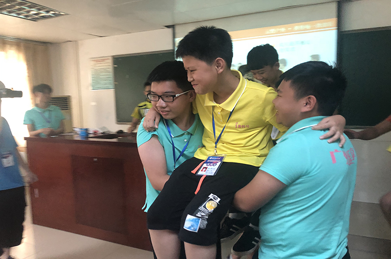 接着,老师教我们如何托运伤员,并做了示范。我们这一排中的三个人开始练习。过一会,老师请同学做示范,旁边的教练鼓励我们上去。