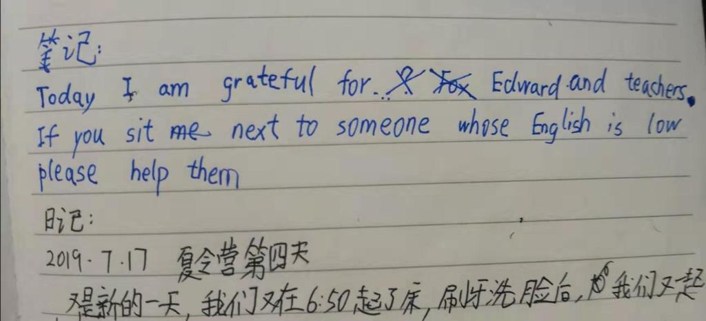 图为子越今天的外教课的互动笔记,大意为:今天我要感谢爱德华Edward老师,他和我们讲,如果你身边的同学英语不是很好,请你记得对他/她给予帮助