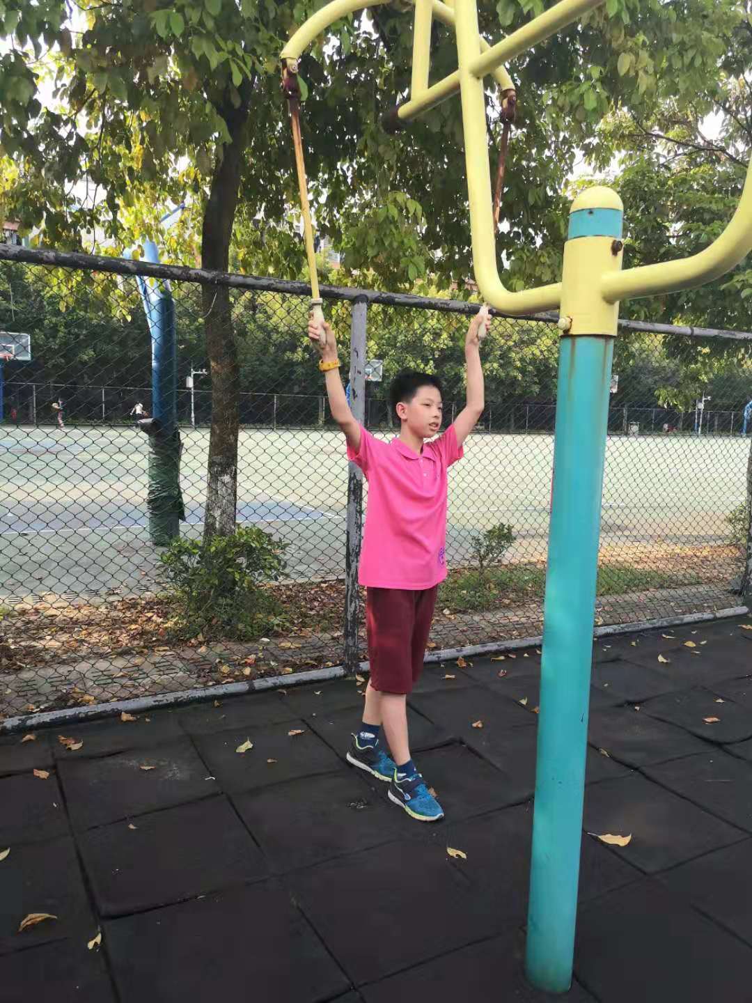 汪定桐在使用器材,但似乎在看着前方的其它同学