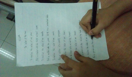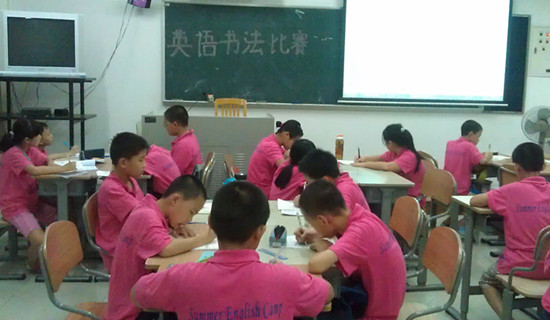 还有一个奖项就是英语书法比赛。书法比赛是晚上的时候进行的,那时候,他们个个都认认真真的埋头写字,那个样子可真可爱!我们班评出了一等奖:刘云枫,二等奖:曾钰仪,邓卓骏,三等奖:欧阳文杰,林芷羽,郑永栋。虽然我们班的是小学生,但是他们的英语字体都写得很不错。