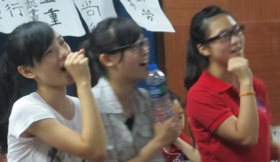 结营节目的初演时间迫在眉睫。在征求同学们的意见之后,我们高中班决定要大合唱。所谓“众人拾材火焰高”,在选歌时候,大家集思广益,纷纷选出自己心中的那首歌。晚自修伊始,大家便选定陈奕迅的一曲《岁月如歌》,兴致勃勃地合唱了之后,却发现别的班级早先定了这一曲。无奈之下,我们便更换成其他的歌曲。大家七嘴八舌地喊出了许多歌曲名,诸如张国荣的《追》、《you raise me up》等等。令我惊异的是,我们90初流行的或是经典的歌曲和歌手也在他们这个年龄的孩子所喜欢。在挑选歌曲的过程中,大家唱歌的热情逐渐高涨。当音乐从音响中流淌时,她们瞬间俨然成了歌手,各自忘情地拿起手机或是水瓶当做麦克风唱了起来。她们歌声中迸发出了青春活力,脸上洋溢着十足的热情。大家通力合作完成了古巨基的一曲《情歌王》。紧接着,在那句“我在等一个人,在等我的永恒,告诉我爱不单行别害怕”中唱出了她们内心对爱的向往,一曲《洋葱》也被她们演绎得款款深情。快乐的时光总是短暂的,大家直到自修结束还依依不舍,热情依旧高涨,仍想留在教室继续未完的歌。