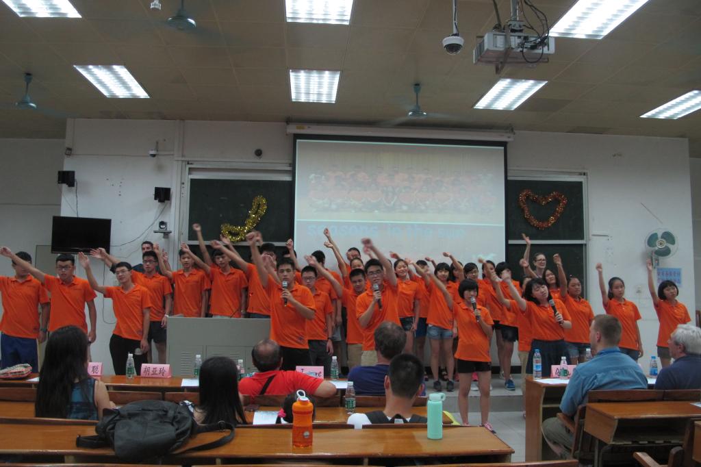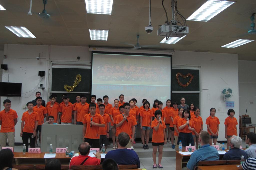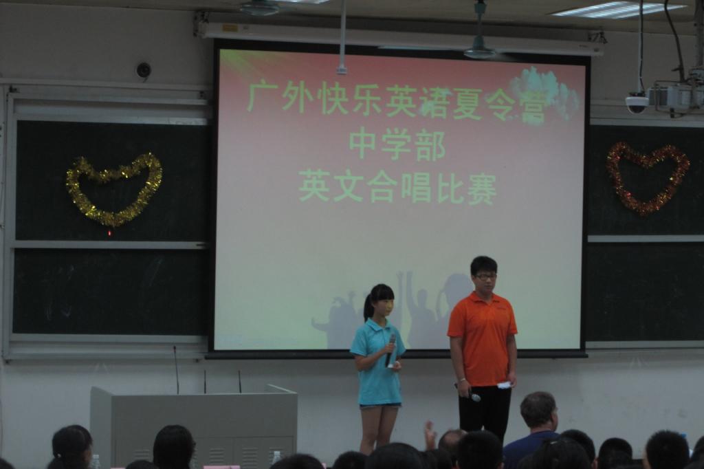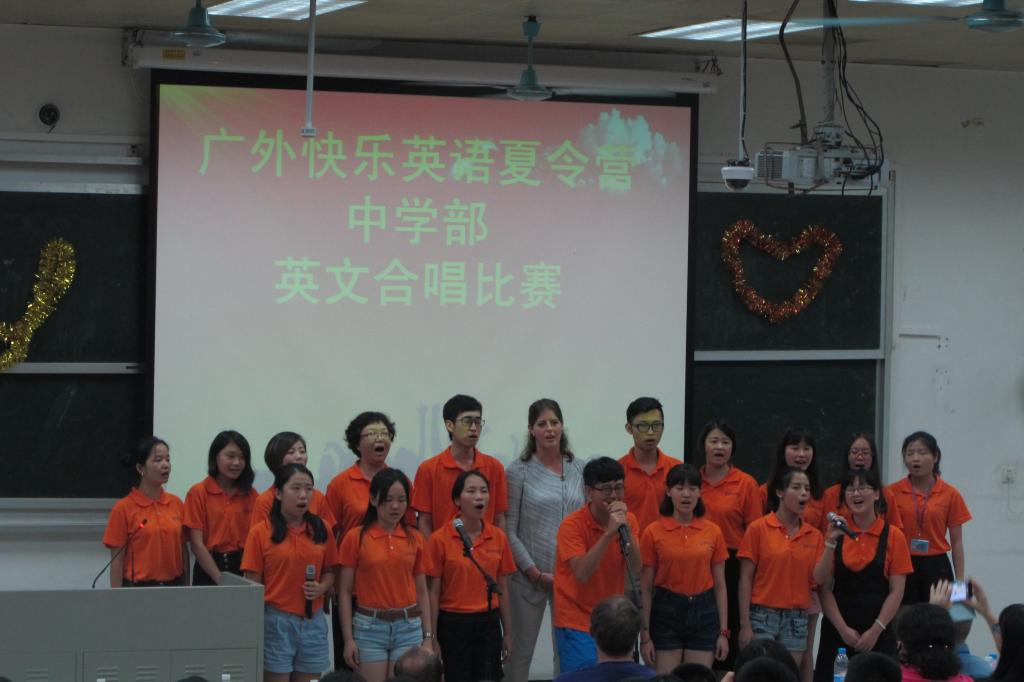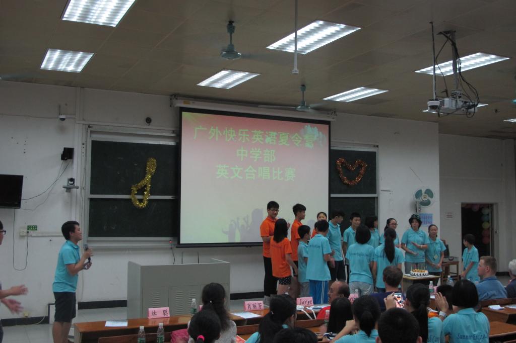 本网讯 7月26日晚,广外快乐英语夏令营中学部举行了英文合唱比赛。中学部六个班级都展现出团队精神,团结一心地向外教评委们、观众表现出连日来努力排练的好成果。