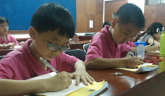 本网讯 7月26日晚,广外快乐英语夏令营小学部开展英语硬笔书法比赛,同学们兴致勃勃,争相比“美”!