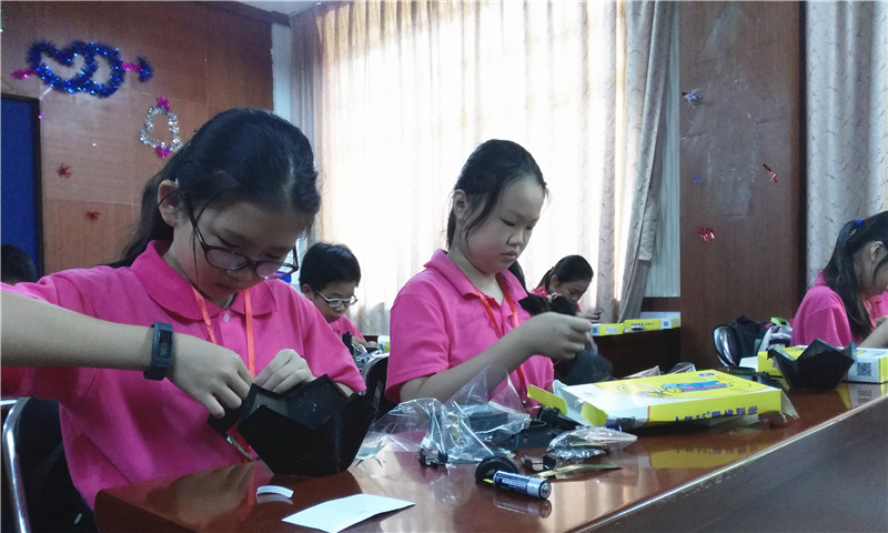 在前面短暂的了解了电路的基本原理后,并在任课老师的一步步带领下,同学们开始了观星仪器的制作。先是完成了观星仪器的地步制作,由开关、底座以及电池构成。跟随着老师的步伐,同学们都逐一的完成了底部的制作。由于顶部的构成需要按特定的顺序安装,很多学生都弄错了。但经过任课老师一一的纠正后,同学们都顺利的完成了安装。