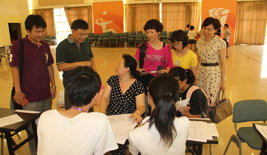 本网讯 7月14日是夏令营学员报到日,广东外语外贸大学继续教育(公开)学院院长何勇斌、副院长孙亚玲、党委副书记曾建文来到南校区夏令营新生接待处视察新生接待情况。