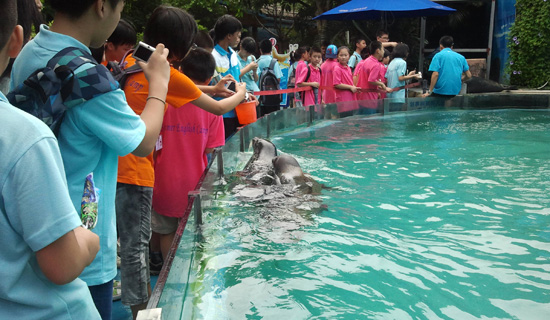 经过一个小时的车程,我们到达美丽的鳄鱼公园。下车以后,我们到鳄鱼公园门口集中,映入眼帘的是一个大游泳池,同学们好奇地上前看,是一条10多米长的大鳄鱼,懒洋洋的躲在水里晒太阳。同学们都在惊叹这条鳄鱼巨大的体型,七嘴八舌地猜测鳄鱼的体重。合照过后,我们陆续进入,正式开始我们亲近鳄鱼之旅。