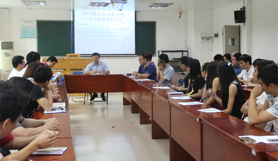 本网讯 7月29日上午10:00,广东外语外贸大学2013年快乐英语夏令营总结会在第三教学楼220室举行。刚刚完成夏令营工作的老师和同学们再次欢聚一堂,共同回顾、总结夏令营工作。继续教育(公开)学院院长何勇斌、副院长陈开举、副院长孙亚玲、党委副书记曾健文出席本次会议。夏令营全体工作人员以及合作单位代表参加了本次会议,会议由何勇斌主持。