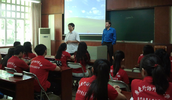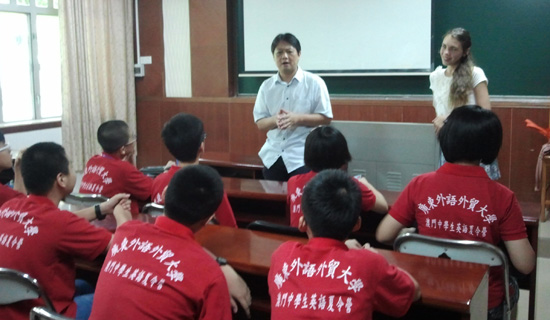 本网讯 8月1日,澳粤青少年交流夏令营正式开始上课。上午约九点,夏令营课程设计老师吴文权带领三位外教Glenn,Nate,Kate分别来到学员的课室,向学员们介绍他们未来15天的外教,并跟学员解释课程设计的意图。吴老师说,课程分成两部分,前半部分是教大家如何完成精彩的演讲;后半部分让学员充分发挥才能,将小故事改变成戏剧,并演绎出来。面对精彩的课程,面对可爱可亲的外教,学员们都很兴奋,很期待。