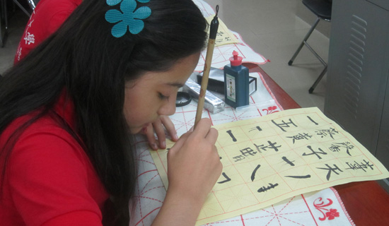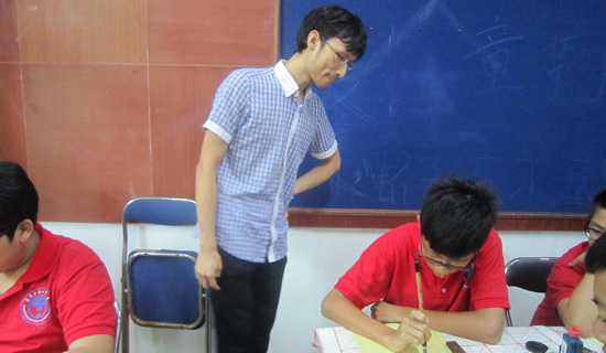 今天的书法课终于可以挥笔写字。昨天,书法老师详细地讲述了中国书法的发展史,学员们很感兴趣。他们迫不及待,想亲身体验一把,挥起毛笔写字,今天这节课终于能如愿。课堂之初,老师让学员们尝试一下写字,绝大部分没学过毛笔字的同学执笔就写,没有任何运笔技巧,为自己写出的、难看的毛笔字感到不满。班上唯一一位学过毛笔字的男生挥笔写了几个漂亮的字,引起全班同学的羡慕。此时老师拿起毛笔,向全班同学讲述如何才能写出漂亮的毛笔字。比如说,“一”字,看起来简单,但是写起来就要讲求运笔技巧,才能写得美观大方。老师说,“一”字首先要逆锋起笔,转笔下行,中锋右行,到尽处提笔向右下顿笔后向左上收笔。讲完要领,在黑板示范几次,然后让学员自己在纸上练习。使用这技巧写出来的“一”,好看多了。