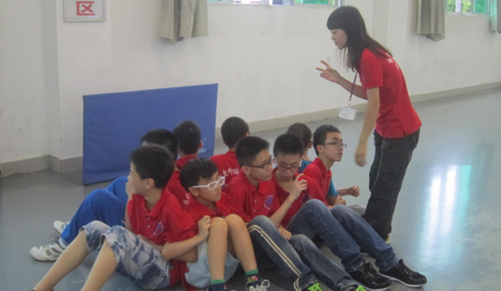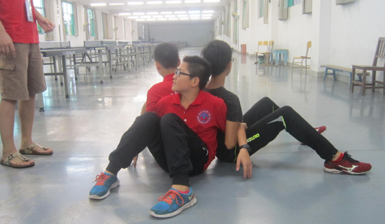 原本要举行拔河比赛,但天公不作美,突然下起大雨,拔河被迫取消,一群上乒乓球课的学员也被迫困在室内。班主任当机立断,把学员们集中起来,开展Back to Back的团队游戏。back to back游戏规则,首先两个人,背对背坐着,双手互缠,在手不着地的情况下,背靠着背站起来,成功后再加入一人。学员们参与热情极高,开动脑筋探索技巧,从最初小组两人开始不断挑战,直到最后六个人一群尝试站起来。