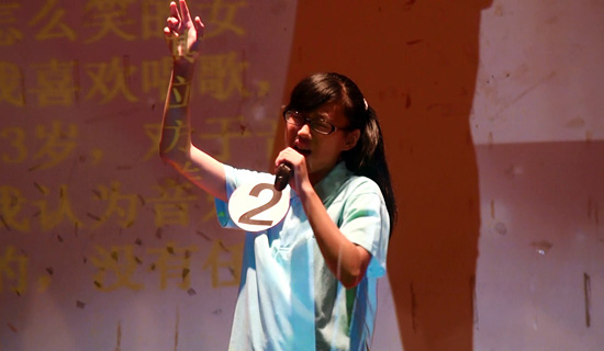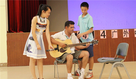 本网讯 为提升同学们的表演能力,丰富学员们的课外活动,让同学们全面地展现自我,2014广外快乐英语夏令营中学部举办了“夏令营好声音”歌唱比赛。7月22日晚,“夏令营好声音”决赛在南校区学生活动中心拉开帷幕。夏令营外教团队Salvador、Curtis、Zita、John担任了本场比赛的评委。经过激烈的比赛,最终来自初二班的郑淇方获得了本次好声音的一等奖。美国国际教育合作公司副总裁陈艳女士,教学组组长丁龙、学工组组长陈秋林、中学部部长赵正苗、小学部部长胡亚玲及相关人员出席了本次活动,各班班主任和夏令营中学部全体学员观看了本次比赛。节目由张楚桦和潘渝林主持。