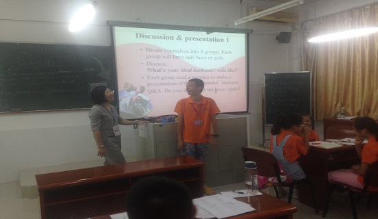 这一话题的小组讨论复习了之前所涉及的所有词汇和表达,学员在外教的带领下进行了积极的讨论,之后由每个小组的一个代表进行发言。这个活动锻炼了孩子公众演讲的能力和临场应变能力,受到了孩子的热烈欢迎。最后,老师对这一话题进行了总结,认为“Love means responsibility, commitment and loyalty”(爱情意味着是责任、承诺和忠诚)。学员通过这样寓教于乐的教学方式,既扩大了知识面,又锻炼了公众演讲的能力。如果说教学是一种艺术,那么孩子的笑脸就对艺术之美的最好诠释!