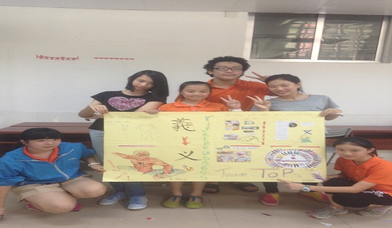 本网讯 2015年7月30日,广东外语外贸大学快乐夏令营国际班的教学活动精彩继续。上午,国际班在220课室举行了一场名为“英语综合技能大赛”的比赛。比赛一共分为三个环节:“单词接龙”、“知识竞答”和“剪贴拼图”。在“单词接龙”环节,学员分为六个小组走到讲台来进行单词接龙,该环节考验了学生的临场反应能力和英语单词量。紧随其后的是“知识竞答”环节,该环节设置了若干有关英美文化知识的题目,各小组进行抢答。最后进行比拼的是“剪贴拼图”,同时也是“技能大赛”最为重要的环节。该环节要求小组分工协作,利用报纸和杂志进行小组艺术创作。