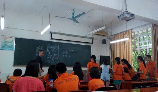 本网讯 2015年7月31日,广东外语外贸大学国际班1班的教学活动按计划继续进行。上午,来自美国的外教Ron用一场别开生面的游戏拉开了教学活动的序幕,该游戏通过规则的设定将学院分为四个组,各个小组派代表到讲台来抽取小组的题目,最后获胜的小组获得Ron提供的奖品。