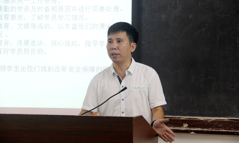 第一场综合业务能力培训九点准时开始。赵正苗首先介绍了夏令营工作组的架构设置,工作人员配备情况,便于班主任工作职责的衔接。接着,赵正苗重点介绍了班主任的工作职责和工作要求,要求班主任注重细节,从学生报到的第一时间关心、关爱学生,密切关注学生的生活、学习,并以学生的安全为首要职责,并用具体的案例介绍了突发事件的处理办法。