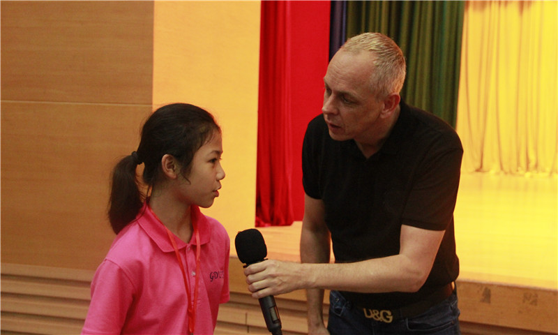随后,外教逐一上台进行自我介绍并与学员们进行现场互动。外教口语教学是我校快乐英语夏令营的特色,外教极富感染力的语音语调,丰富生动的体态语言,热烈活泼的师生互动,能够引起学生极大的学习兴趣。我们的外教在广外任教多年,经验丰富,除了能够让学员感受到纯正的英语口语外,同时还能够让学员们体会到原来可以这么快乐、轻松地学习英语。学员们可以在“乐学”中学会“会学”,从而进一步提高英语口语的水平。参加开营典礼的外教分别是 Edward、Alex、Alex Sisco、 Bim、Casey。Edward首先上台自我介绍,他非常幽默,丰富的肢体语言加上夸张的表情,很快便吸引了大家的注意力,现场气氛变得非常活跃,响起一阵阵掌声。接着,其他几名外教也分别进行自我介绍并和学员们进行互动。外教和学员们的快乐互动将开营典礼推向高潮。