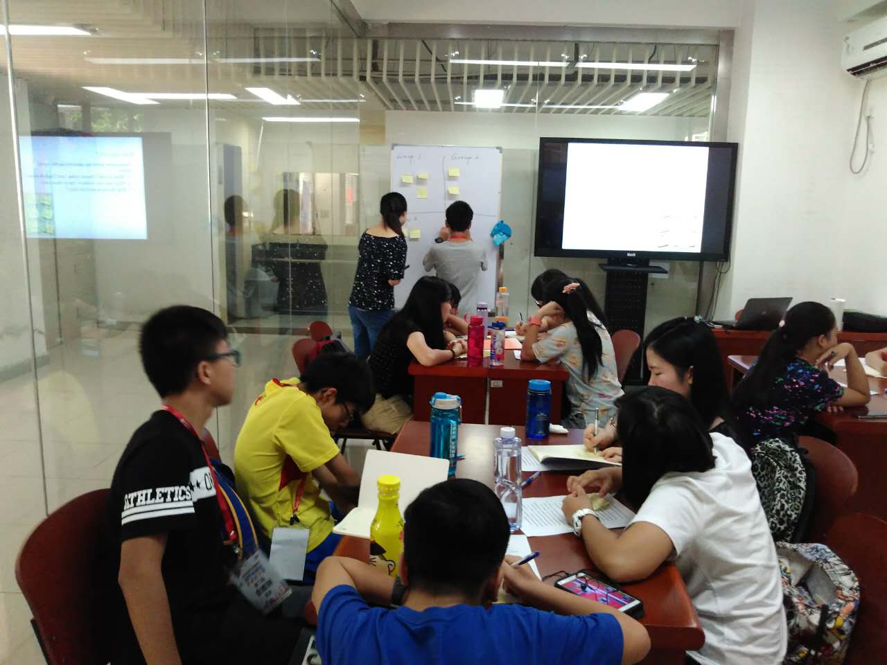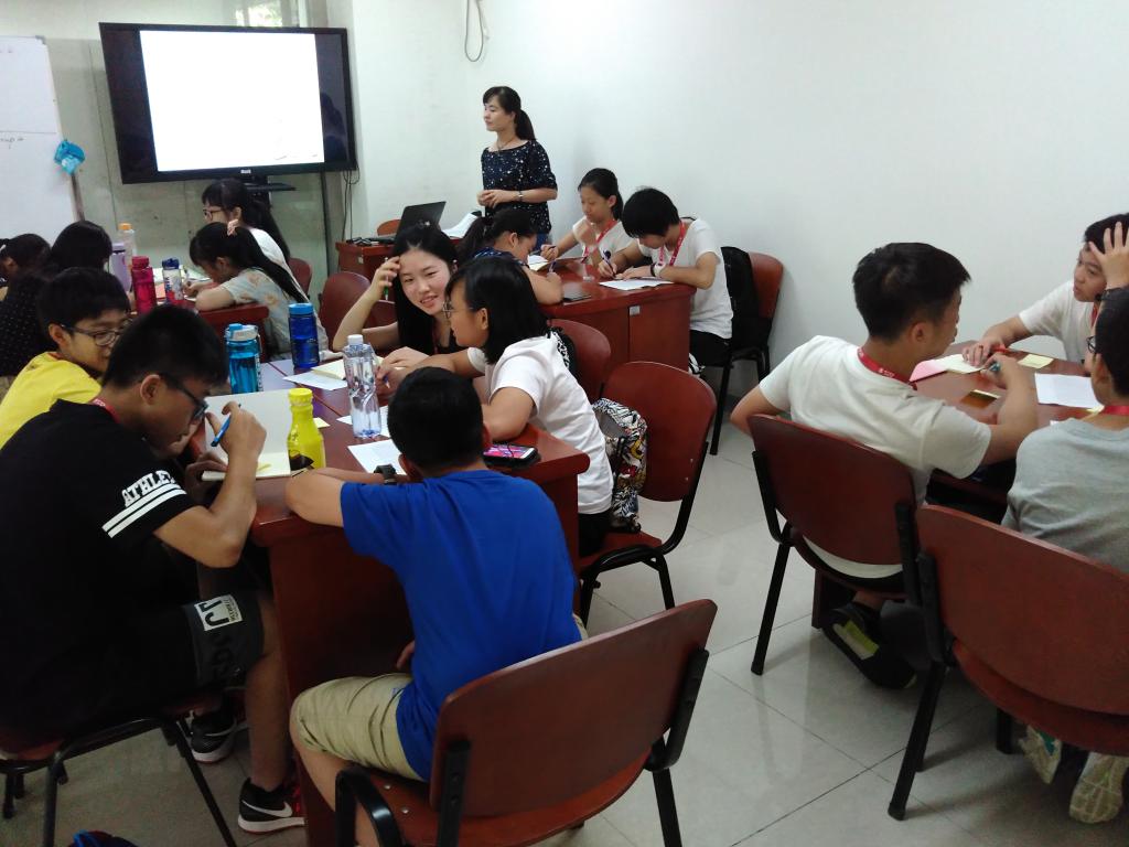 本网讯 这是中澳夏令营的学生的第一节英语课,为了让大家能够更加熟悉彼此,课上首先让大家进行自我介绍。英语老师先让每位同学把自己的中英文名字、兴趣爱好写在便利贴上,然后每个小组以群体的形式在黑板上贴上自己的纸条,最后通过让学生互相介绍自己组的成员的形式来让学生认识彼此。如此既不失趣味性又能让大家更好地了解对方。