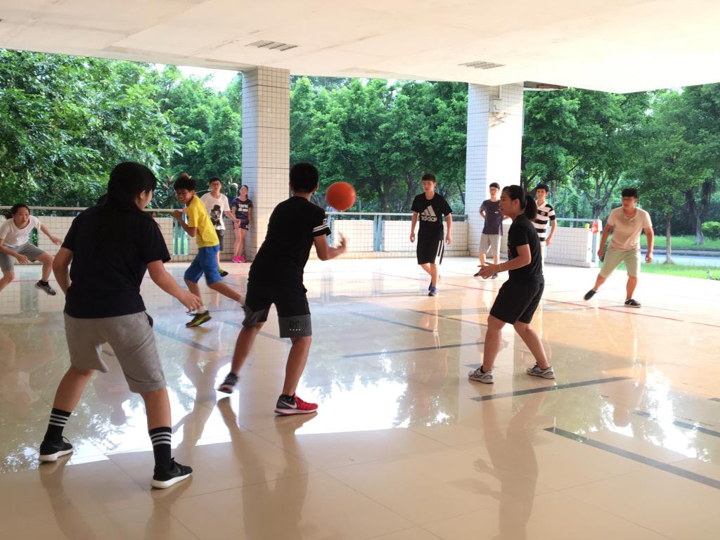 团队拓展课上以小组为单位在用气排球玩一群人保护一个queen的游戏,来训练同学的团队协作能力和反应能力