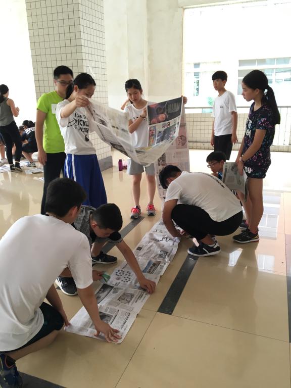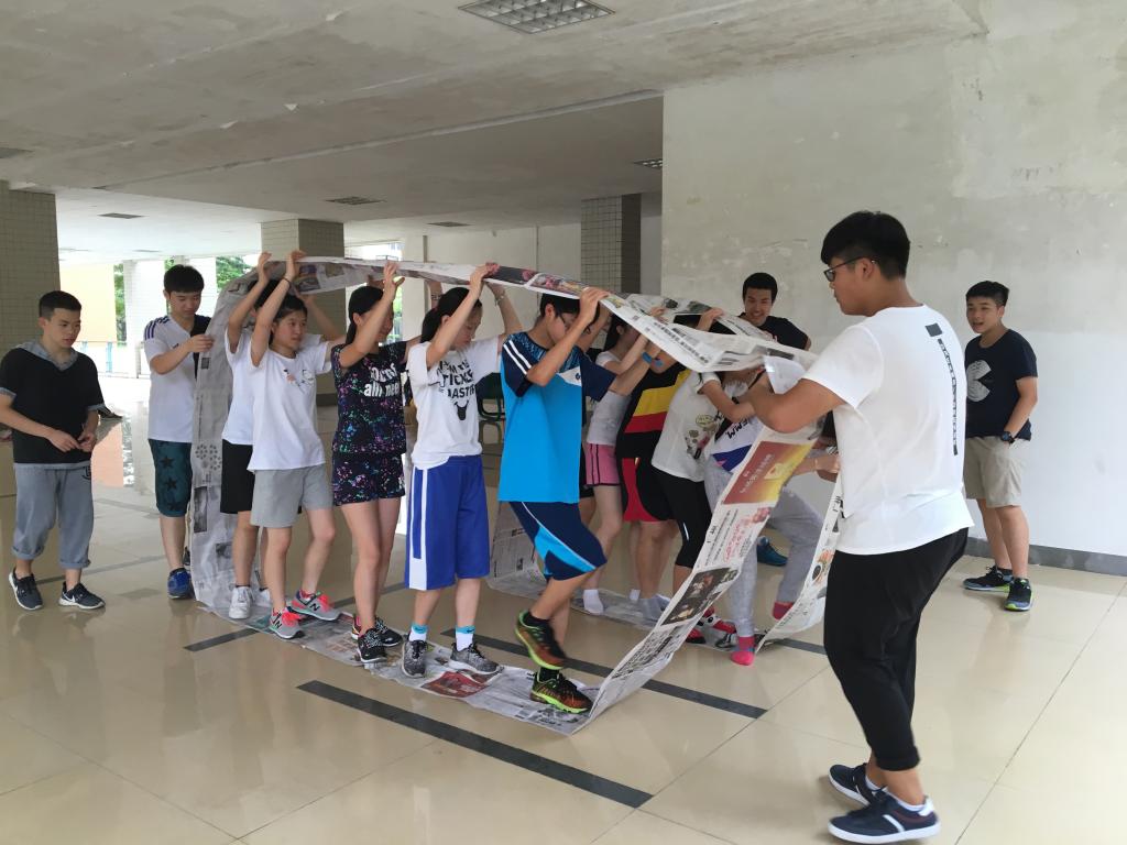 学生把报纸报纸粘好以后开始进行游戏比赛。有五个人在报纸中间行走,报纸两端分别有一名同学在带着报纸走,以确定组员不会踩破报纸或是摔跤,速度最快的那一组获胜。每一个成员都是获胜的关键,只有认真携手走好每一步,协调性好,才能获得最后的胜利。