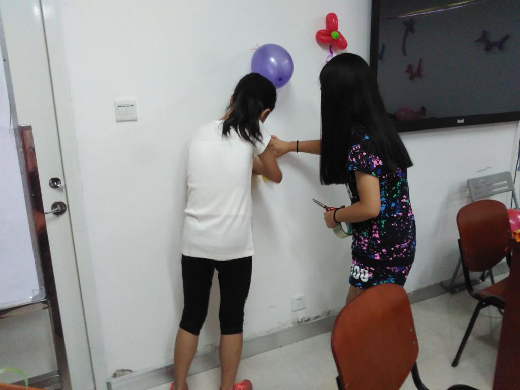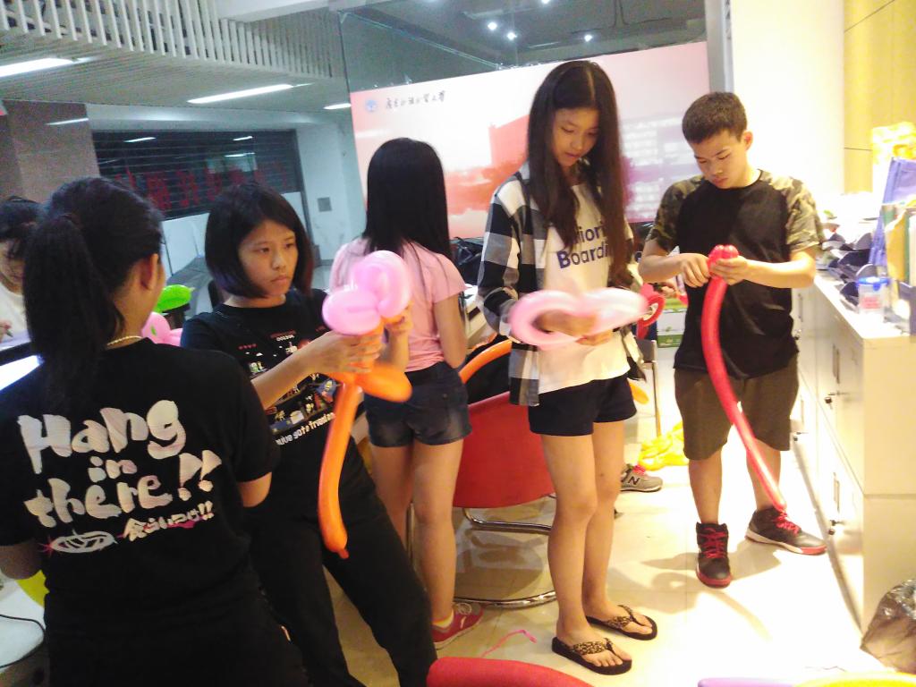 学生正在准备布置现场的材料,气球的形状都是手工制作哦。