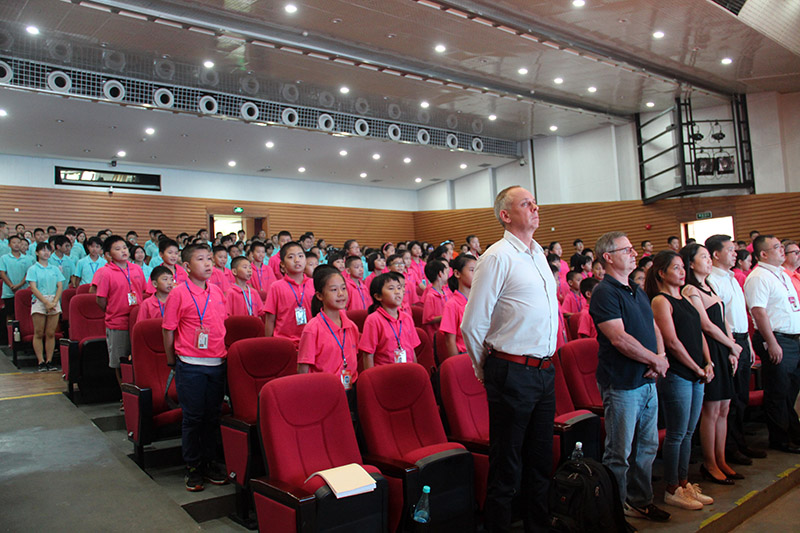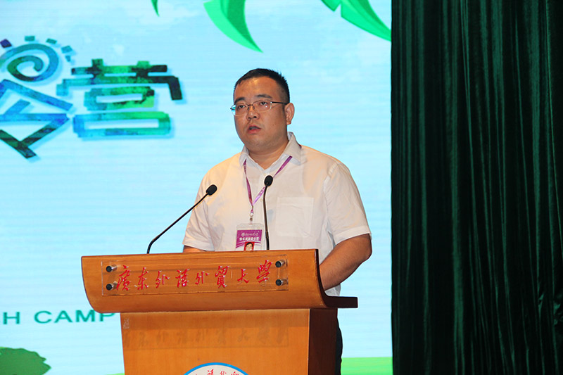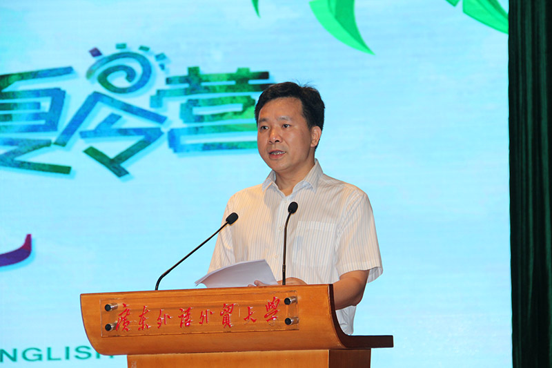 上午9时,开营典礼在庄严的国歌声中拉开帷幕。任跃忠首先致开幕辞,他说,广东外语外贸大学是一所具有鲜明国际化特色的广东省属重点大学,是华南地区国际化人才培养和外国语言文化、对外经济贸易、国际战略研究的重要基地。暑期快乐英语夏令营是广外的传统品牌项目,至今已成功开办近20年。在多年的办学中,我们坚持做到“四个一流”:一流的管理、一流的师资、一流的环境、一流的服务。希望学员们能够在夏令营学会坚强、学会独立、学会自立,每个学员都要做“三会”学生:会休息、会学习、会健体。同时,他要求全体教师、班主任、工作人员要严格贯彻夏令营的各项工作要求,做好各项工作,确保本次夏令营的成功举办。