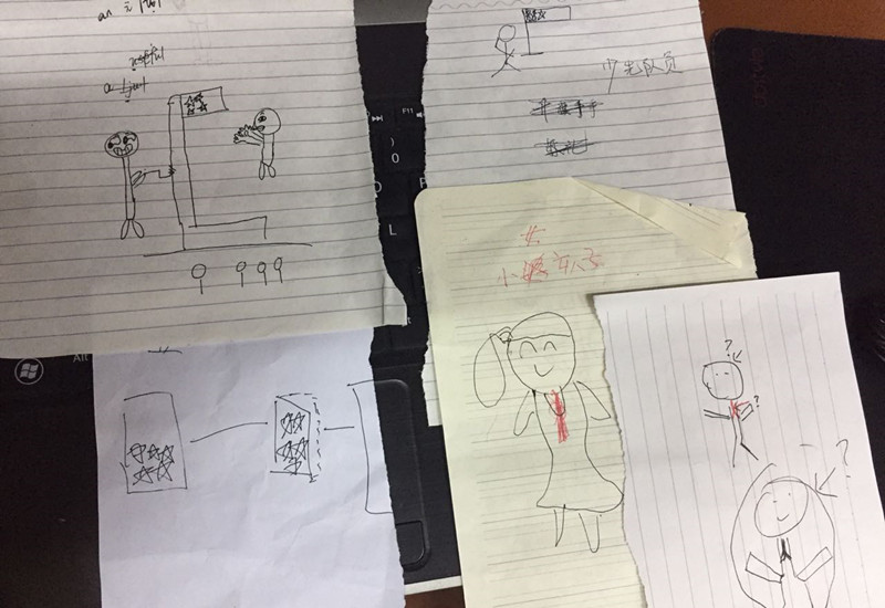 在本次游戏开始前,班上16位同学们随机分成四个小组。游戏开始前,每组第一位同学根据所给的词,用1分钟作画,然后第二位组员用30秒的时间看第一位组员的作品后,自己用1分钟作画并给下一位组员看30秒……每组最后一位同学根据所看到的图画猜词语。