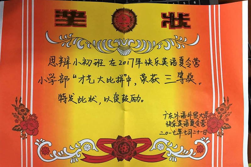 思辨营小初班奖状
