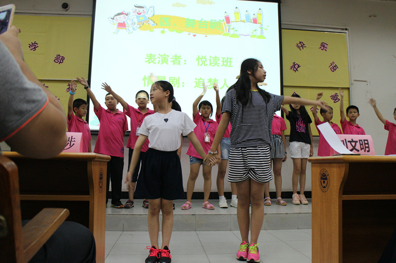 本网讯 2017年7月21日晚,广东外语外贸大学快乐英语夏令营小学部的才艺大比拼如期举行。在此次比赛中,悦读小达人班一举夺得才艺比赛冠军与班级综合一等奖,成为当晚最大赢家。悦读班同学们自导自演的舞台剧《追梦人》凭借积极向上的主题以及小演们出色的表演脱颖而出,拿下才艺比赛部分的一等奖;他们也凭着合唱歌曲《Lemon Tree》整齐划一的响亮歌声荣获合唱比赛的一等奖。