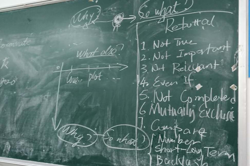 7月24日,思辨营初高班学员进一步学习思辨课程。在辩论课上,学员在导师的教授指引下学习Rebuttal(反驳)的方法,了解如何合理有据而不乱阵脚地提出反对对方观点的理由来进行辩驳。在模拟论坛课上,导师通过拓展学员的横向思维和纵向思维引导学员develop ideas(提出点子、发展思路)。横轴上的“What else?”、纵轴上的“Why”和“So what”的设置有利于学员进一步打开思维局限,提升学员纵向挖深、横向拓宽的思路能力。