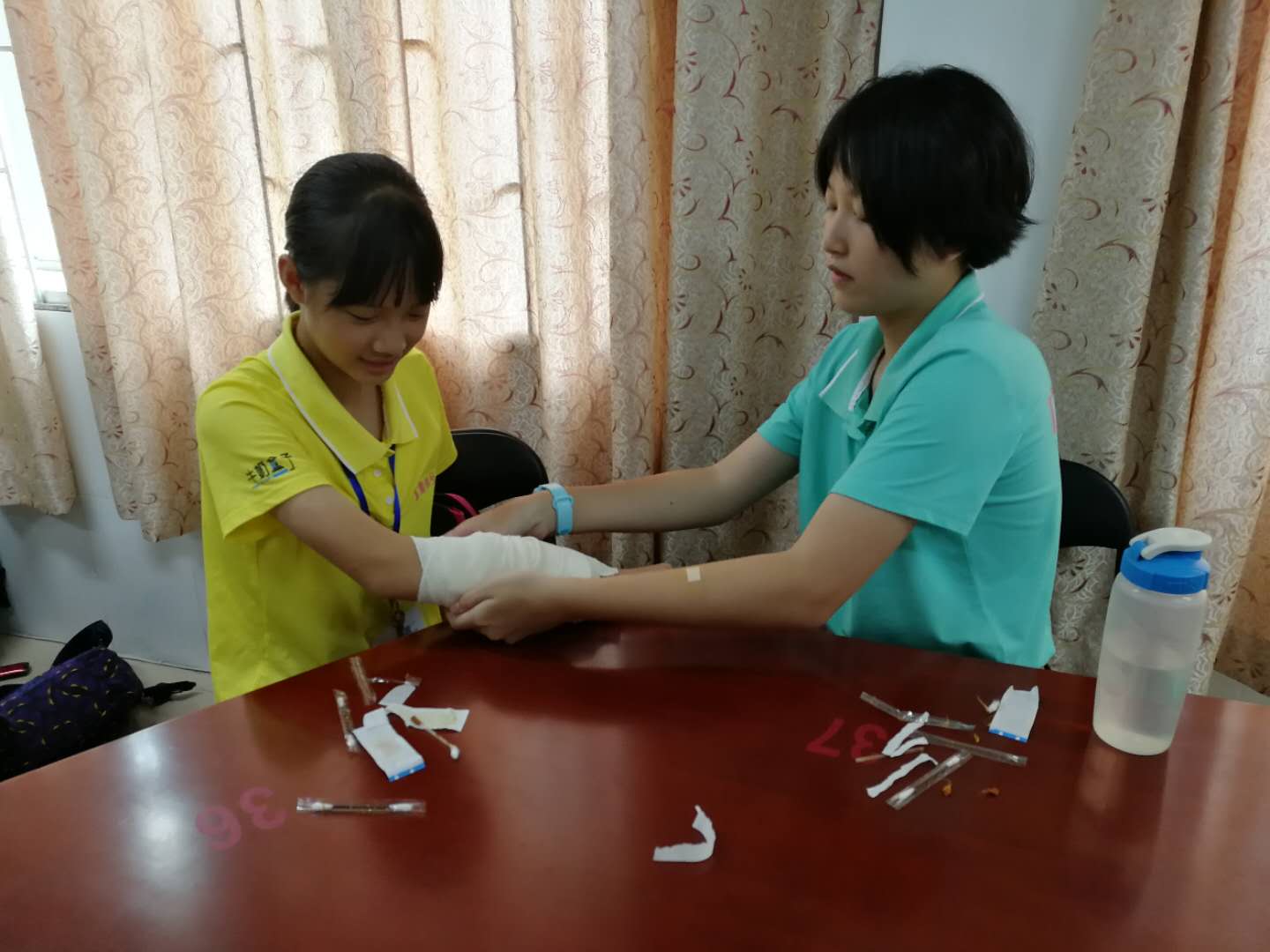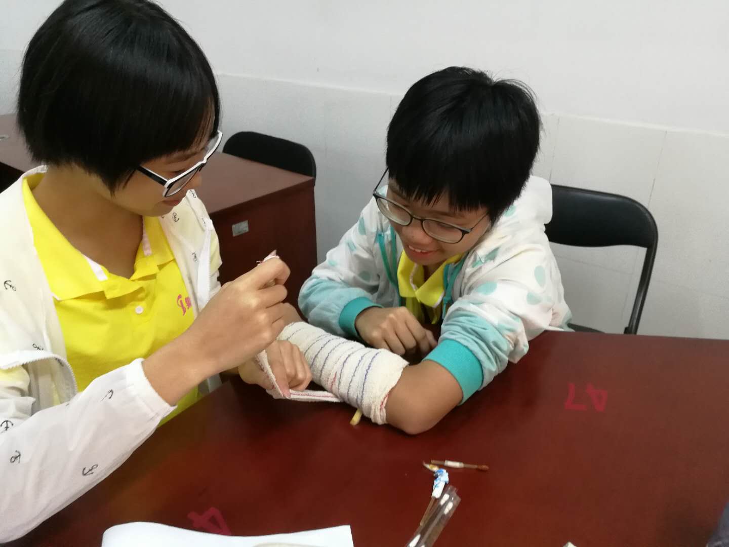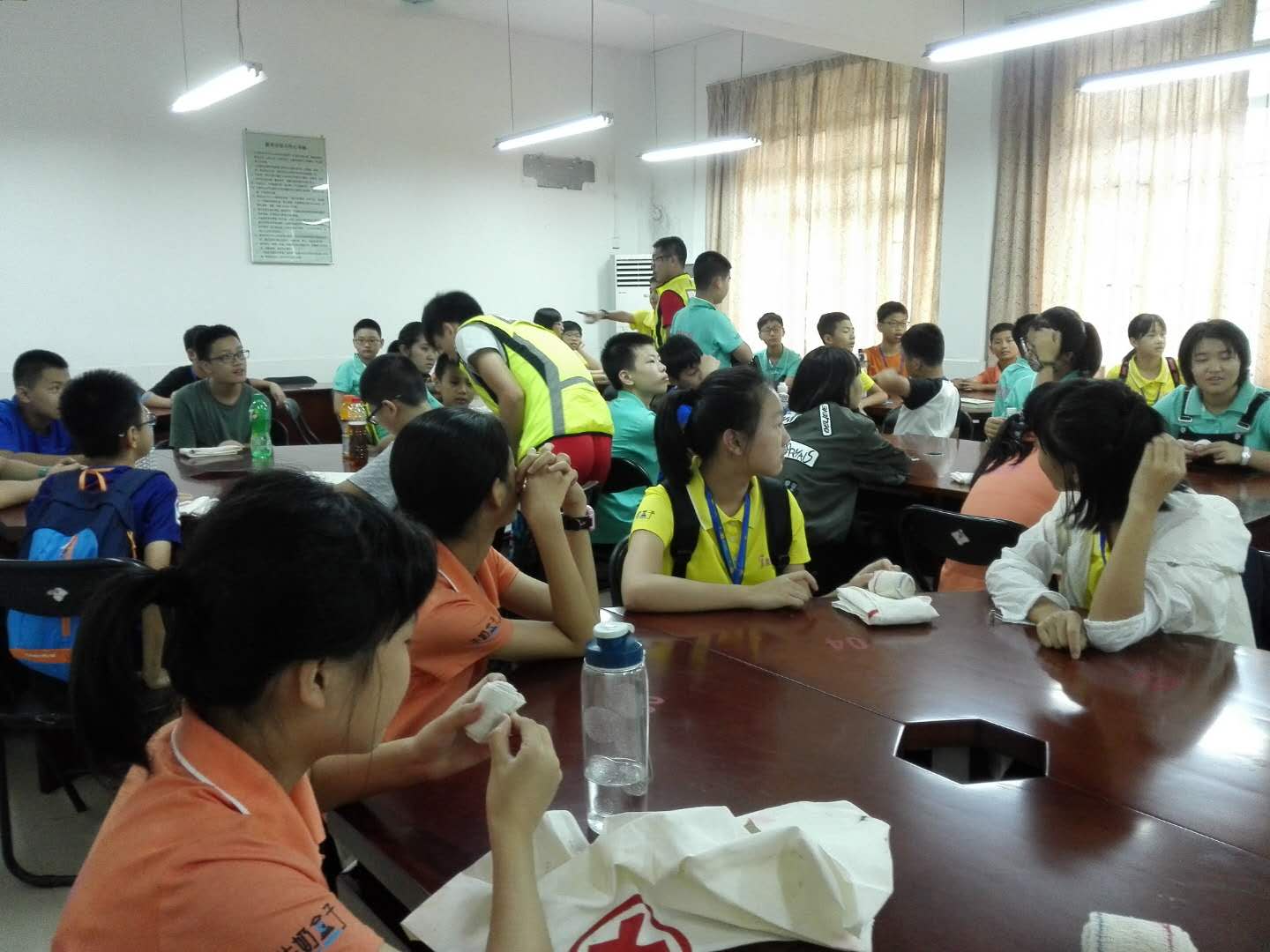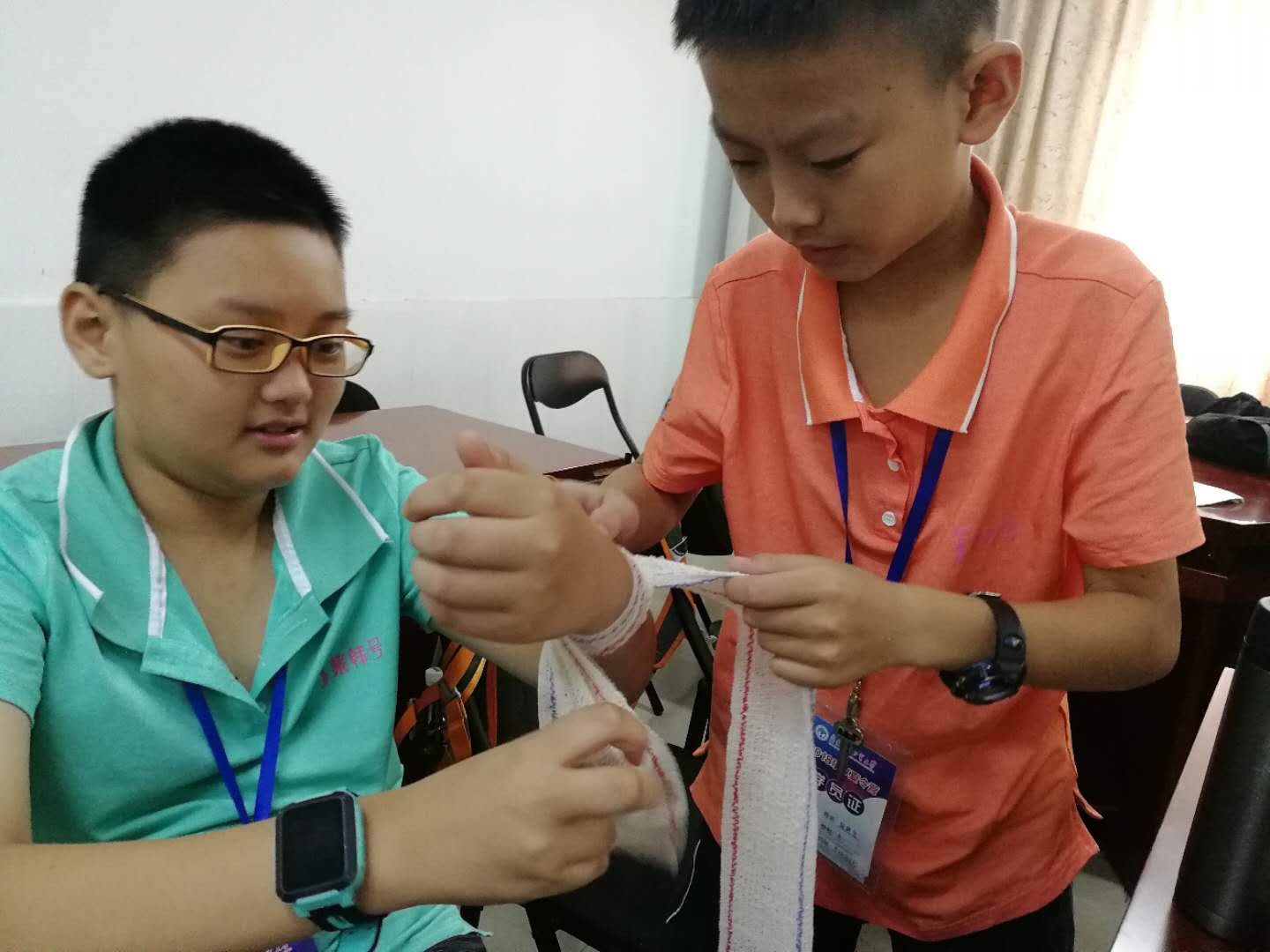 学员在等待着教练教给他们如何绑绷带