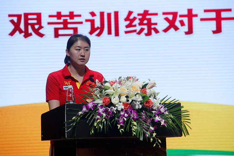 焦刘洋首先播放了一段2012年伦敦奥运会上女子蝶泳决赛的比赛视频,带领大家重温了比赛时从落后、追赶到超越的紧张时刻,当看到焦刘洋最终获得第一名的时候,夏令营全体学员激动的鼓掌。焦刘洋说,没有人生下来就是冠军,成为奥运冠军的几率只有五千万分之一。要想成为冠军,就必须付出更大的努力,给自己设定目标,经过艰苦的训练和磨砺,实现目标并不断取得新的突破。焦刘洋分享了她的游泳故事:5岁送进体校学习游泳,12岁被送往广州军区部队游泳队,14岁参加十运会在200米蝶泳项目中获得银牌,15岁成为国家队的队员,17岁获得奥运会银牌。这些经历和成就深深地震撼着夏令营这些9岁到18岁的学员们,因为他们正处于这个年纪,还远未达到焦刘洋的高度,但是他们心里明白,要拥有这些成绩,就必须吃苦耐劳、刻苦训练,不断挑战自己和超越自己。