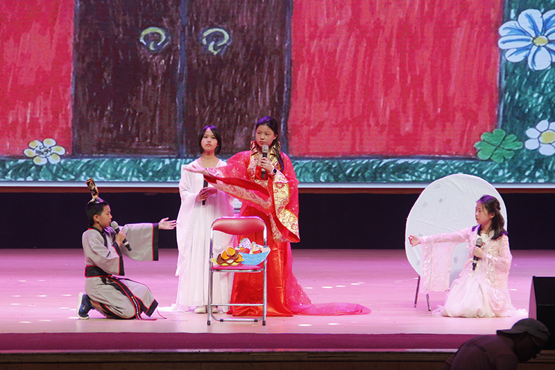 之后,进入闭营典礼的第二环节“文艺汇演”,由班主任骆娜加上何朝阳、李旖洋、郑铭哲三位学员做主持。首先上演的绘本C班、绘本A班和交流B班学员共同为大家带来的舞蹈串烧:《大梦想家》+《c哩c哩》+《team》,展现出激情飞扬,多姿多彩而又快乐的夏令营生活;科学营的音乐剧《开学第一课》,带领大家回顾夏令营第一天的故事;戏剧营B班带来舞台剧《Sprayzee》,学员的表演生动而有趣;绘本故事营B班大合唱《something just like this》,带起全场热翻天;外教交流营A班的合唱《sugar》,温馨而甜蜜;思辨营的《思辨群英会》,内容丰富,英文朗诵+现场辩论+演讲展现了思辨的精髓;外教交流营B班的《good time》是一首很经典的歌,场下观众跟着节奏一起挥动肢体;外教交流营D班带来的英文话剧《灰姑娘》,再现经典童话故事;戏剧营A班表演的是大合唱《a little love》,展现出夏令营大家庭的温暖;戏剧营B班的走秀《mini show》十分精彩,学员分组上场,青春活力,姿态万千;戏剧营A班带来经典英文舞台剧《嫦娥奔月》,小演员们的表演得到观众和家长们的热烈掌声;外教交流营C班的《Dream it possible》,告诉大家要拥抱梦想,追求梦想;最后压轴上场的是由绘本故事营A、B、C三个班的歌舞表演《We're going on a bear hunt》,学员们精彩的表演,促使演出达到最高潮。