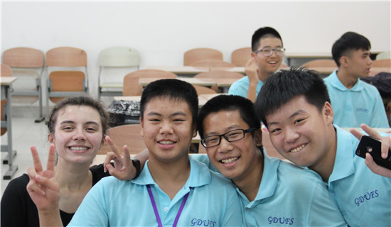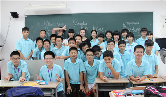 初二班的学生们从Jacky的第一节课就深深地喜欢上这位跨过太平洋来到这里的“美国辣妹”Jacky了。她年仅17岁,是美国那边的一位大学生。在她的课堂上,学生们常常被她安排的游戏活动吸引其中,通过紧凑有趣的活动了解美国文化和日常英语的表达方法,真可谓是“寓教于乐”。