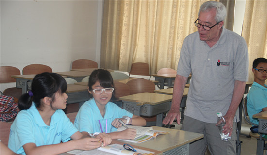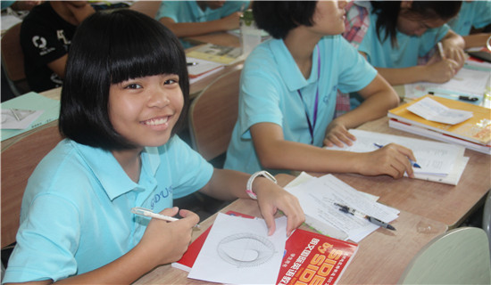 首先走进初二(1)班,班里的同学们都在埋头用功。咦?大家都在做些什么呢?走近一看,原来大家正在按照Zero老师的教法,用尺子在纸上画爱心。2班这边是什么情况呢?今早的课程由外教John来负责,他喜欢走近每一位同学,与他们面对面交流,以提高同学们的英语口头表达能力。