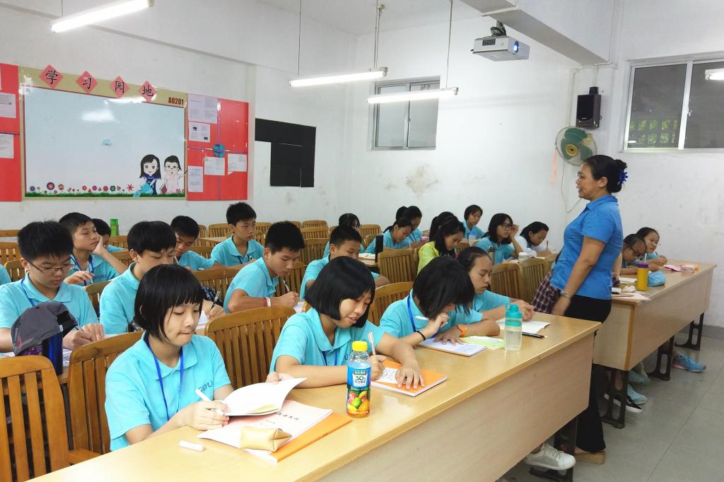 本网讯 7月18日下午两点半,初二班课堂迎来了营期第一节语法课。语法课上,一袭蓝衣的牛卫红老师用生动有趣的小故事和活泼的比喻,引导同学们进入英语语法神奇的世界。牛老师还在课堂上教了同学们简明易记的16个时态记忆法,让同学们觉得获益匪浅!