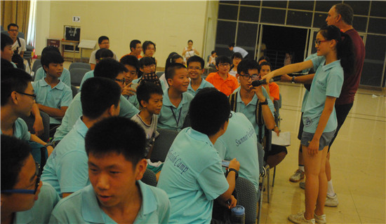 初二班的同学赛前为班级选手加油(图为郑汶锋同学和林硕朗同学)