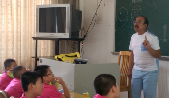 随着夏令营开营,学生们也开始了日常生活学习,小学四年级班主要有三门课:综合英语、外教口语、小牛顿课。其中,外教口语是课程量最大、也是最主要的课程,而担此重任的,则是来自墨西哥的Jorge。