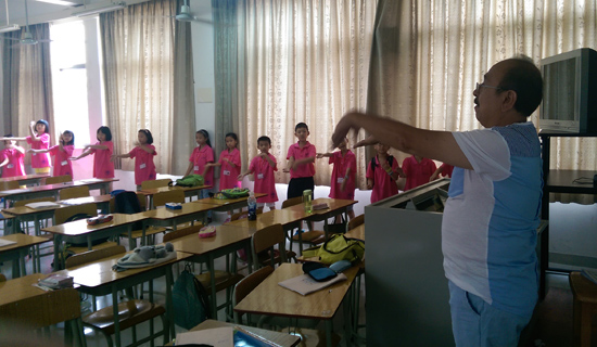 在Jorge的带领下,同学们时而做互动游戏:一人充当人像一人充当镜子的模仿秀,时而离开座位边跳舞边学英语:手舞足蹈地学习了大家都喜欢的《Goodbye Song》,整个课堂气氛十分活跃。但有时课堂纪律不好时,Jorge显得有点无奈,和Jorge聊天得知,他觉得四年级的孩子们淘气是正常的,其实他的喉咙已经有点哑了,但还是手舞足蹈的教同学们跳数字舞。